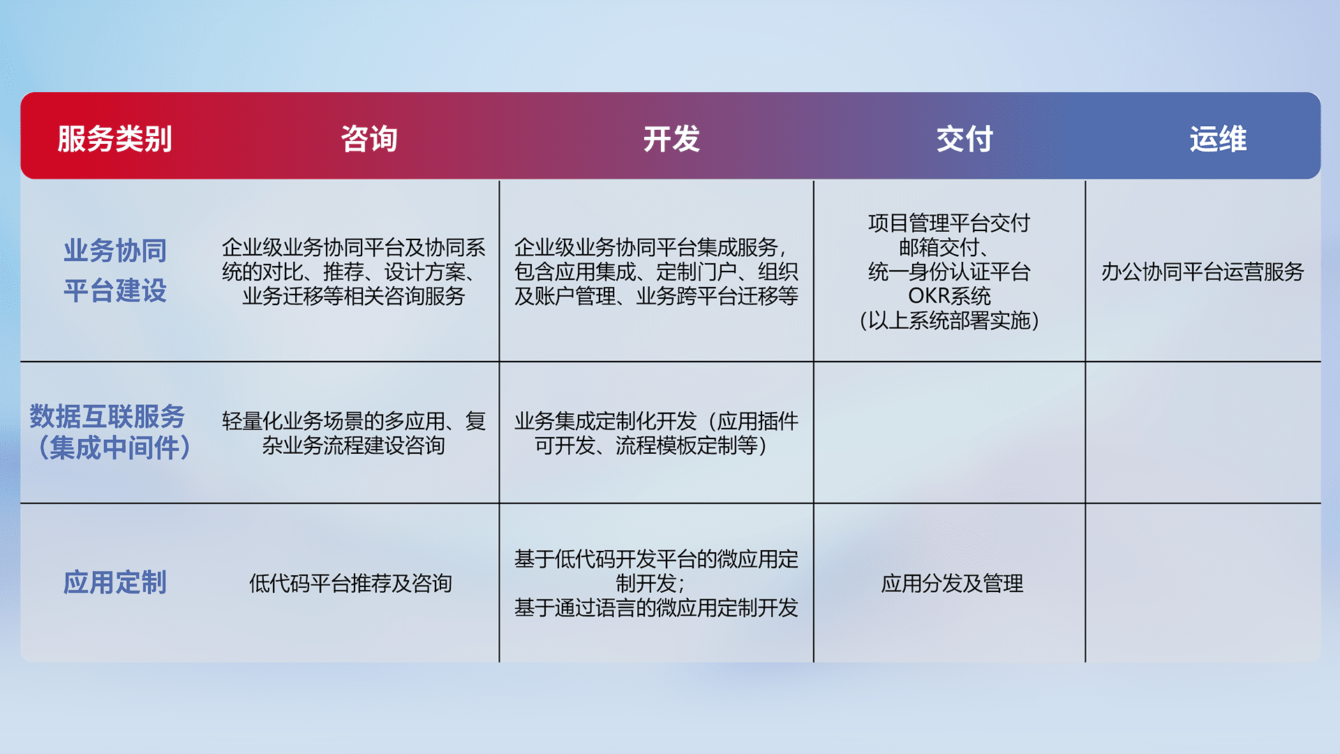 针对钉钉、、企微、、IDaas等平台级产品提供产品的规划、、方案、、、交付、、、定制化开发等服务,,,实现如统一协同办公、、智能客户服务、、混合会议管理、、智能数据查询、、等业务场景,,,,实现数字化转型。。