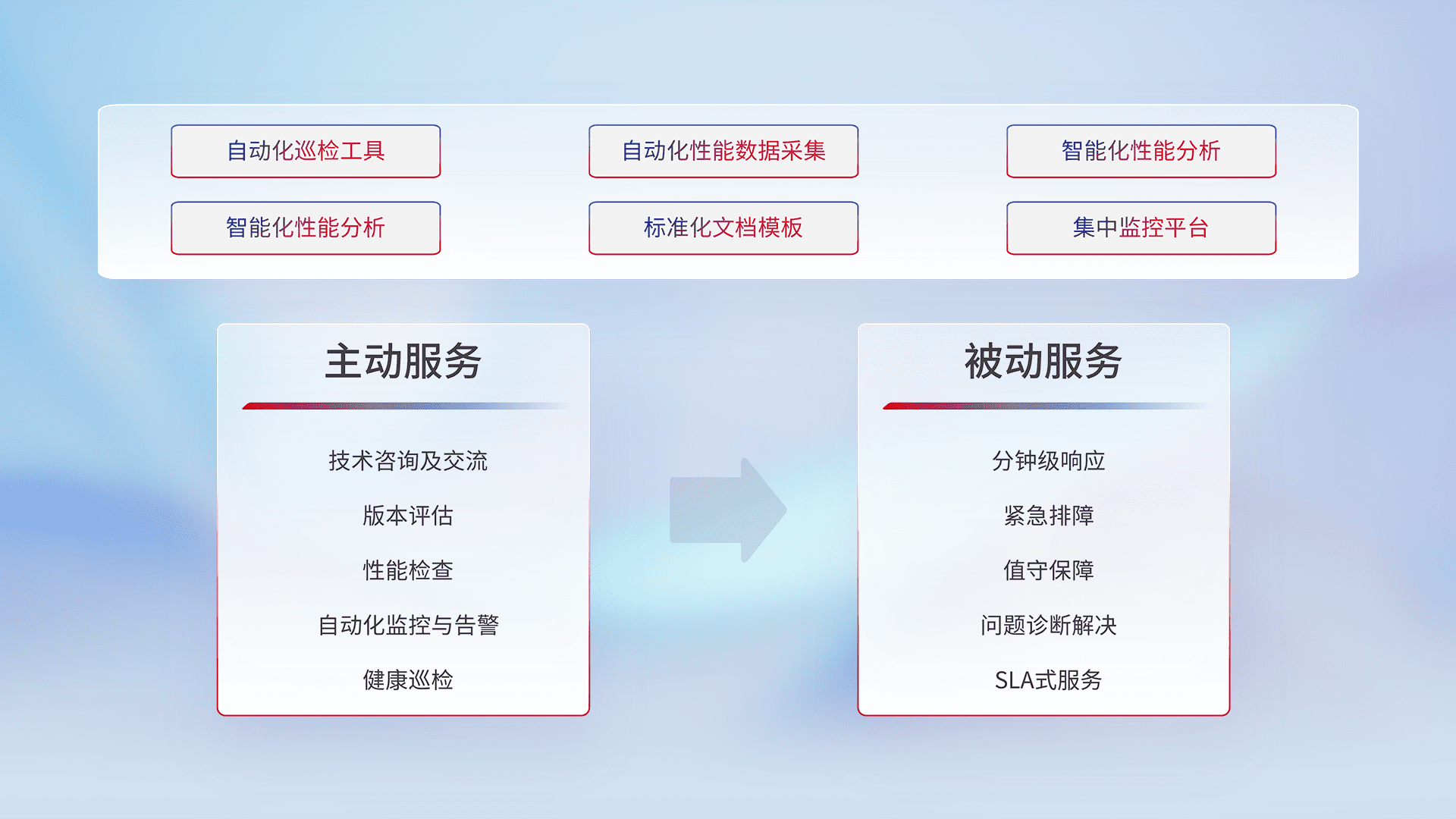 智能化工具和标准化文档,,保障服务质量,,提供主动服务(包含技术咨询、、、、版本评估、、、性能检查、、自动化监控与告警、、健康巡检)和被动服务包含(分钟级响应、、紧急排障、、、、值守保障、、、问题诊断解决、、SLA服务)。。。。